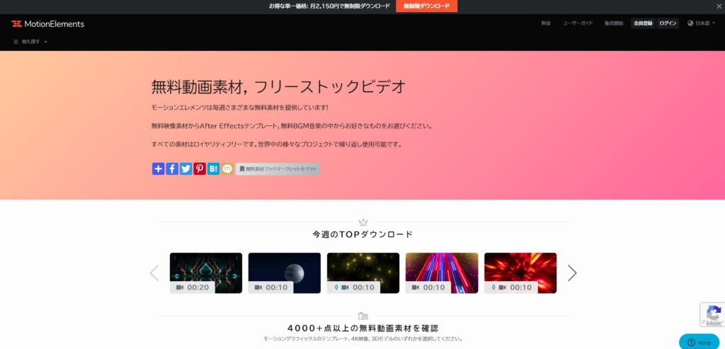 MotionElementsは動画や音楽などさまざまな素材を有料・無料で配布しているサイトです。